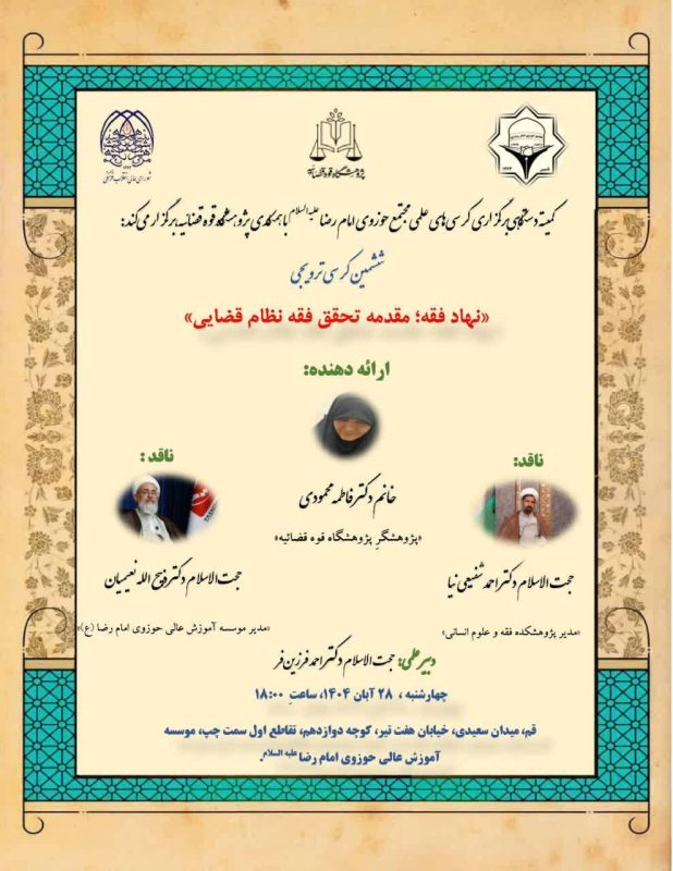 نشست تخصصی «نهاد فقه؛ مقدمه تحقق فقه نظام قضایی» روز یکشنبه ۲۸ آبان ۱۴۰۴ با همکاری پژوهشگاه قوه قضاییه و مجتمع حوزوی امام رضا(ع) شهر مقدس قم برگزار میشود. این رویداد از سلسله نشستهایی است که طی یک سال اخیر با محوریت «فقه قضایی»، «فقه نظام عدالت» و «الگوی قضای اسلامی» در پژوهشگاه قوه قضاییه برگزار شده است و اکنون با تمرکز بر «نهاد فقه» ابعاد دیگر مسئله را دنبال میکند.