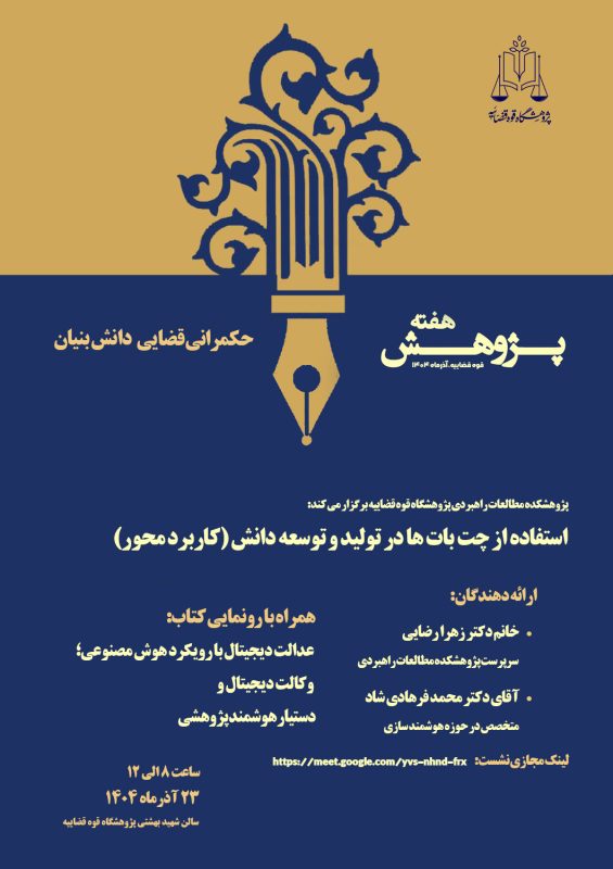 پژوهشکده مطالعات راهبردی پژوهشگاه قوه قضاییه در چارچوب برنامههای «هفته پژوهش»، نشست تخصصی و کاربردی «استفاده از چتباتها و ابزارهای هوش مصنوعی در پژوهشهای قضایی و حقوقی» را برگزار می نماید. این نشست روز یکشنبه ۲۳ آذرماه ۱۴۰۴، ساعت ۱۰ الی ۱۲ در سالن جلسات پژوهشگاه به صورت حضوری و مجازی اجرا خواهد شد.