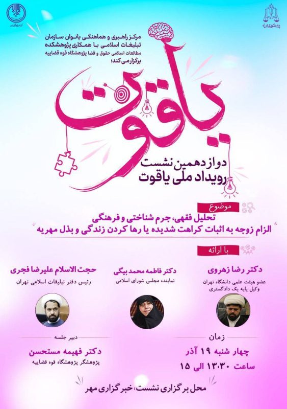 به گزارش روابط عمومی و اطلاع رسانی پژوهشگاه قوه قضاییه، در این نشست، دکتر رضا زهروی، دکتر فاطمه محمدبیگی و دکتر علیرضا فجری از اساتید برجسته فقه، حقوق خانواده و جرمشناسی به بررسی ابعاد فقهی، حقوقی و روانشناختی الزام زن به اثبات «کراهت شدید» در قالب ترک زندگی مشترک و بذل مهریه می پردازند. دبیر علمی جلسه نیز دکتر فهیمه مستحسن، پژوهشگر پژوهشگاه قوه قضاییه است.