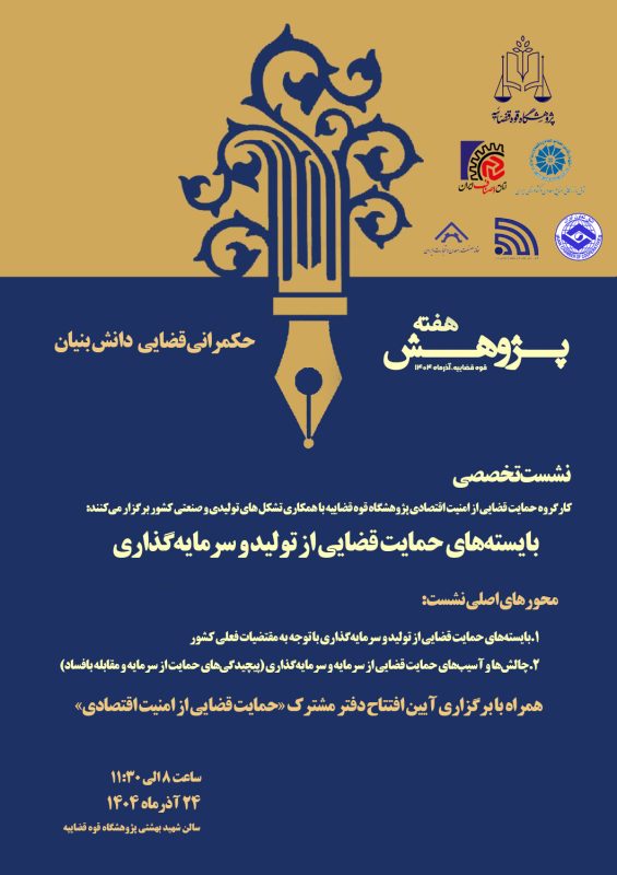 پژوهشگاه قوه قضاییه نیز با بسترسازی برای تعامل چندجانبه بین دستگاه قضا، تشکل های تولیدی و صنعتی، مراکز پژوهشی و با مشارکت سایر ارکان حاکمیتی، «حمایت قضایی از تولید و سرمایهگذاری» را مورد توجه جدی قرار داده است. در این راستا کارگروه حمایت قضایی از امنیت اقتصادی با برگزاری نشست هم اندیشی در تاریخ دوشنبه ۲۴ آذر ۱۴۰۴ به آسیبشناسی این موضوع و بررسی راهبردها و راهکارهای مناسب در جهت حل مشکلات تولیدکنندگان و حمایت قضایی میپردازد.
