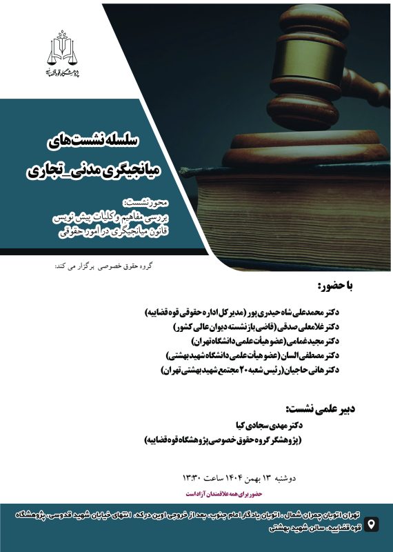 1. اخبار و دستاورد, آخرین اخبار, گروه حقوق خصوصیبررسی کلیات پیش نویس قانون میانجی گری در امور حقوقی؛ ۱۳ بهمن Posted on بهمن ۱۱, ۱۴۰۴بهمن ۱۱, ۱۴۰۴ by روابط عمومی 11 بهمن دکتر کاظمی در مراسم تجلیل از آرای برگزیده قضات: قاضی در عین حمایت و صیانت از منزلت و استقلال قضایی باید از حقوق ملت و سلامت قضایی مراقبت کند